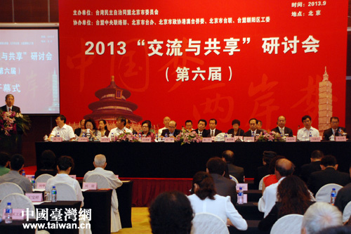 2013年9月5至11日,應邀前來參加第六屆“交流與共享”研討會的臺灣親民黨、臺灣人民最大黨等13個政黨、社團和臺灣臺北市、彰化縣等12個基層行政組織的負責人共計28位臺灣嘉賓,與在京臺灣問題專家、臺盟盟員近150人共聚北京亮馬河大廈,以“中國夢、兩岸夢”為主題,就“兩岸圓夢、共創輝煌”、“基層管理、京臺互動”兩個議題進行深入研討,兩岸嘉賓通過思維和理念的碰撞獲取共識,通暢溝通和諧交流,本屆研討會取得了圓滿的成功。