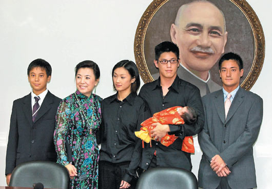 蔣家第四代蔣友青鮮少曝光(左),第五代“小玫瑰”蔣得曦滿月,蔣方智怡(左二)帶著蔣友柏(右二)、媳婦林姮怡(右三)、蔣友常(右一)亮相。(臺媒圖)