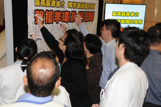 林口長庚發起“譴責醫護暴力,用愛聲援”聯署活動,廣告牌都已不夠簽了。(臺媒圖)
