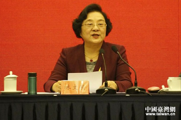 全國政協副主席、臺盟中央主席林文漪代表第九屆中央常務委員會作工作報告。(中國臺灣網 周劍 攝)