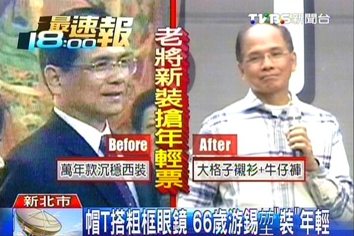 游錫堃過(guò)去就和一般政治人物一樣萬(wàn)年款沉穩(wěn)西裝,現(xiàn)在改變形象,大格子襯衫搭配牛仔褲,連眼鏡都換成霧面銀色粗框眼鏡。除了積極參加年輕人的活動(dòng),政治場(chǎng)合更明顯,大家都穿深色西裝,只有他不一樣。
