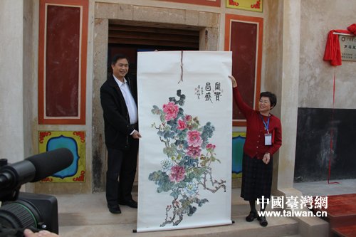 在掛牌儀式上,羅福星烈士的孫女在現場贈給羅福星故居自己親手所繪的大幅牡丹花國畫,她表示,希望蕉嶺富貴、昌盛(中國臺灣網 蕪同 攝)