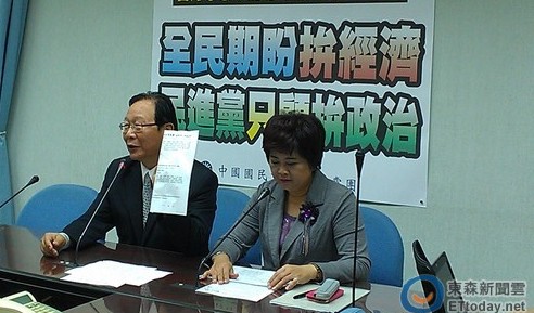 國(guó)民黨團(tuán)召開(kāi)記者會(huì),質(zhì)疑民進(jìn)黨想讓服貿(mào)協(xié)議在本會(huì)期消失。(臺(tái)媒圖)