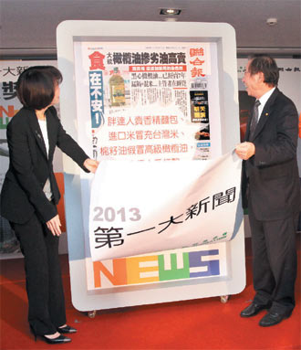臺(tái)灣《聯(lián)合報(bào)》與張榮發(fā)基金會(huì)“票選2013第一大新聞”結(jié)果昨揭曉。張榮發(fā)基金會(huì)執(zhí)行長(zhǎng)聶國(guó)維(右)、聯(lián)合報(bào)總編輯游美月(左)公布第一大新聞為假油等食安新聞。圖片來(lái)源:臺(tái)灣《聯(lián)合報(bào)》