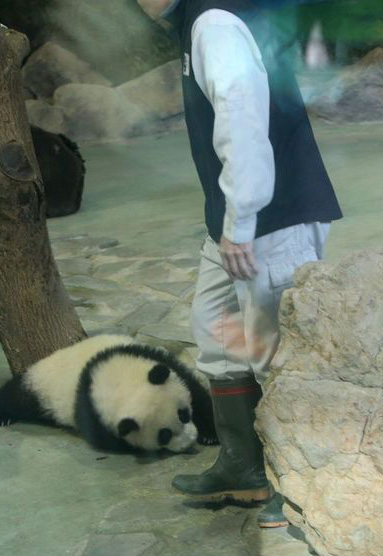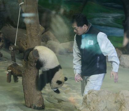 早上8時50分、“上班”時間,圓仔從進入熊貓舍的小門探出頭來,但隨即縮回去,保育員用紅色尼龍繩引誘“圓仔”,它還是不肯出來。早上9時2分,保育員折騰良久,終于把她抱出場放在棲架上,小家伙馬上跳下來要跟保育員回去,因此摔下棲架來。保育員之后在展場繞了1圈,“圓仔”也跟緊追著他后邊跑,保育員只好把“圓仔”放上稍高的棲架,然后趕快跑掉。