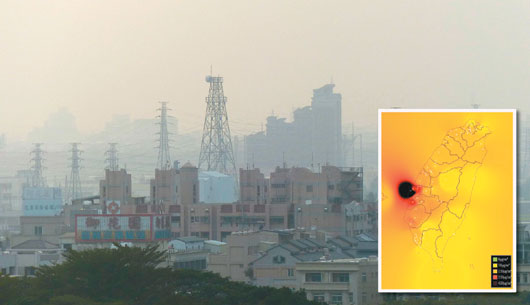 臺灣訂定的懸浮微粒PM10(粒徑小于十微米的塵埃)濃度,每日平均標準值為150μg每立方米;昨天下午云林縣臺西、麥寮、侖背和臺南市樸子的PM10實時濃度都達400以上;臺西的懸浮微粒濃度更一度逼近1000,是標準值的6倍多。