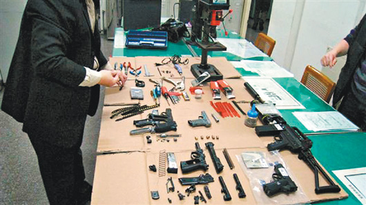 嘉義縣中埔警分局查獲美國籍補習班教師,持有具殺傷力的改造空氣長、短槍各一支,還有大批改造槍械工具。來源:臺灣《聯(lián)合報》