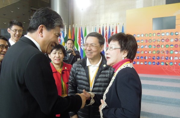 呂秀蓮提早到場,與國民黨籍的“內(nèi)政部長”李鴻源握手寒暄。(臺媒圖)