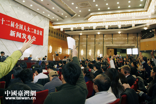 十二屆全國人大二次會議今日在人民大會堂舉行新聞發布會,與會媒體爭相提問。(中國臺灣網 王思羽 攝)