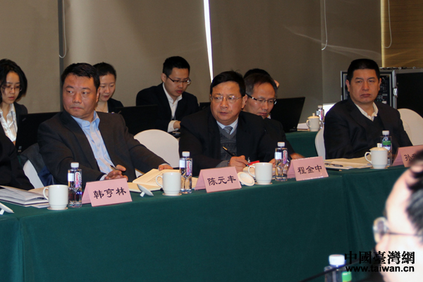 中共中央臺辦、國務院臺辦副主任陳元豐、國臺辦交流局程金中局長、國臺辦研究局副局長孫升亮參加全國政協十二屆二次會議民革界別聯組討論會。(中國臺灣網 王怡然 攝)