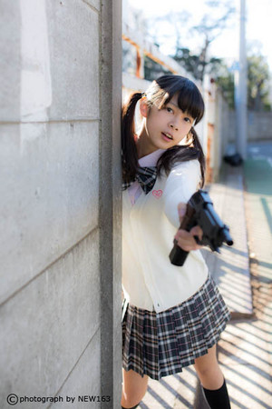 日本學生妹持槍萌照臺灣爆紅,海量美圖超越界。(臺媒圖)