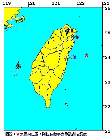 圖中紅星表示震中位置,阿拉伯數字表示該測站測得地震強度。(圖片來源:臺灣氣象部門網站)