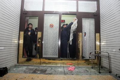 打破議場側(cè)門。抗議學(xué)生18日晚間突破“立法院”側(cè)門的警力,學(xué)生打破玻璃門沖入議場。圖為警方清理玻璃門碎片,避免刮傷人。(圖片來源:臺灣“中央社”)