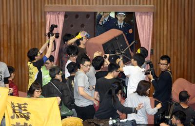 反服貿(mào)學(xué)生18日晚間突破“立法院”側(cè)門的警力,沖入“立法院”議場抗議,拿椅子堵住議場出入口,與警方對峙。(圖片來源:臺灣“中央社”)