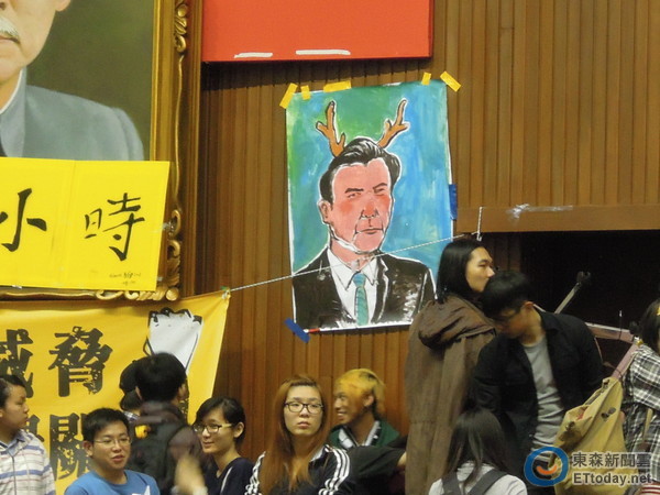 學生持續占領“立法院”議場,有學生畫“鹿茸像”諷馬英九。(圖片來自臺媒)