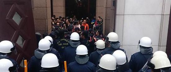 事發時,駐守在“行政院”的40余名警力剛交接不久,根本無法擋下人數占優勢的學生。學生竄入“行政院”后,先沖到主大樓門口,與駐守警方爆發激烈推擠沖突,最后索性靜坐在地上,與警方僵持。另一部分學生在“行政院”內“四處游走”,占領其余大樓,進入后逐層敲門破壞門鎖,打破窗戶,翻箱倒柜,不時與警方發生推擠,企圖占領“行政院”。