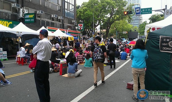 昨日,學生及民眾集結凱道反服貿,人潮從凱道蔓延至中山南路、濟南路、青島東路,反服貿學生團體總指揮林飛帆30日晚間號召大家排班守“立法院”,不過31日下午議場外群眾人數減少,“立法院”青島東路側停車場成為“曬被場”。