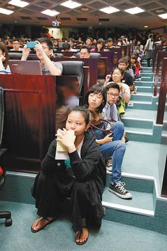 臺(tái)當(dāng)局“經(jīng)濟(jì)部”服貿(mào)校園講座吸引眾多聽眾,連走道都坐了一整排。(圖片來(lái)自臺(tái)媒)