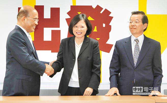 經過“太陽花學運”,蘇貞昌、謝長廷14日先后宣布退選民進黨主席,蔡英文可望重任黨魁。圖為2011年蔡英文宣布由蘇、謝分別擔任競選總部主任委員、總指揮職務。(臺灣中時電子報圖片)