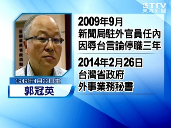 由于郭冠英在2009年間以“范蘭欽”等為筆名發(fā)表文章,遭“監(jiān)察院”通過彈劾,并經(jīng)“公務(wù)員懲戒委員會”決議“撤職并停止任用3年”。郭冠英3月出任“省府外事業(yè)務(wù)秘書”,4月滿65歲屆齡退休后,可領(lǐng)取每月高達(dá)8萬余元月退俸,造成社會輿論嘩然,抨擊有濫用公共資源之虞,及違反程序、玩弄體制、因人設(shè)事、特權(quán)圖利等不公不義等違失。