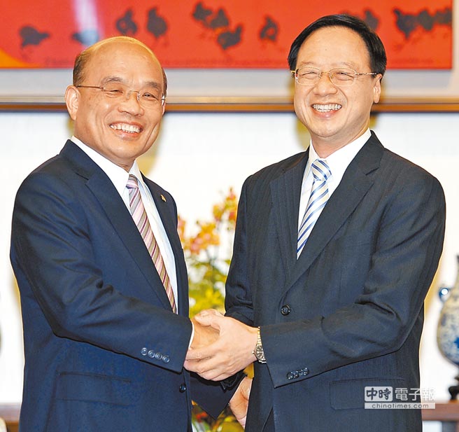 民進黨主席蘇貞昌(左)21日拜會臺當局“行政院長”江宜樺(右)針對核四存廢的議題尋求共識與解決問題,兩人見面時相互握手致意。(圖片來自臺媒)