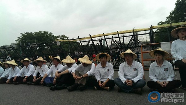 25日下午5點(diǎn),“立法院長”王金平宣布“院會(huì)”休息后,全體“綠委”在黨團(tuán)總召柯建銘帶領(lǐng)下前往凱道靜坐。“立委”姚文智表示,黨團(tuán)成員將跨夜靜坐,表達(dá)深沉抗議;明、后天將與民間社團(tuán)協(xié)調(diào)、分進(jìn)合擊,向馬英九表達(dá)憤怒。由于馬英九辦公室前早已架設(shè)拒馬,“綠委”只能在拒馬前席地而坐,每個(gè)人皆頭戴斗笠、身著“民眾作主”白色T恤。(中國臺灣網(wǎng) 朱煉)