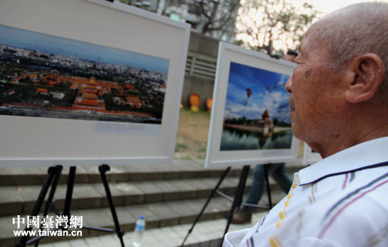 1949年跟隨國民黨部隊撤退到臺灣的老兵高先生,一邊推著自行車一邊仔細欣賞著每張圖片,他說:“曾經(jīng),想要看一張家鄉(xiāng)甚至是家鄉(xiāng)親人的照片都是難上加難的。”現(xiàn)在,兒子在大陸工作,加之近年來兩岸發(fā)展的良好勢頭,直航的開通,已多次回鄉(xiāng)探親、旅游。鳥巢、水立方、長城、故宮這些都去過。如今在家門口又能欣賞到北京的美景,他倍感親切。