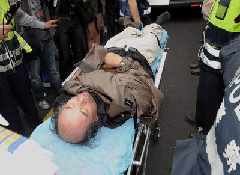 “公投護臺灣聯盟”總召蔡丁貴昨日再度號召群眾包圍“立法院”,蔡丁貴本人也企圖沖撞“立院”,但最后被警方制伏昏倒送醫。(圖片來源:臺灣“中央社”)
