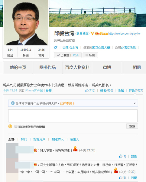秦厚修病逝,陸網(wǎng)友微博“點(diǎn)蠟燭”哀悼。(圖片取自邱毅微博)