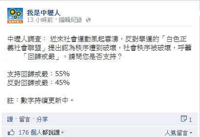 據了解,“我是中壢人”粉絲團是在1日進行網絡投票的,在參與調查的765位團友中,55%支持“回歸戒嚴”,45%則反對“回歸戒嚴”。盡管數據持續更新中,同時統計過程也有篩選IP,但結果還是令許多人詫異。