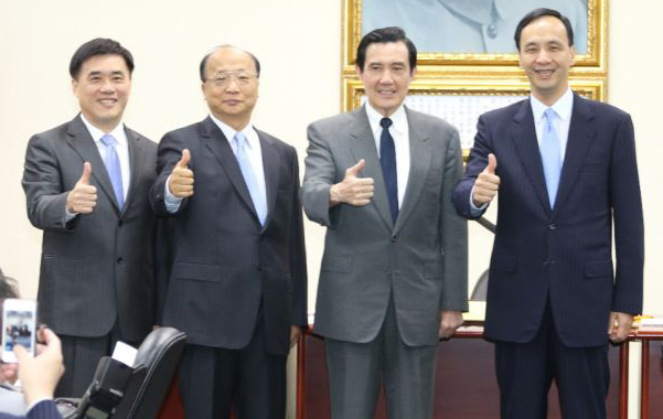 國民黨主席馬英九頒發(fā)聘書給新上任的3位副主席朱立倫、胡志強(qiáng)、郝龍斌,4人并一起合影。(圖片來源:臺灣今日新聞網(wǎng))