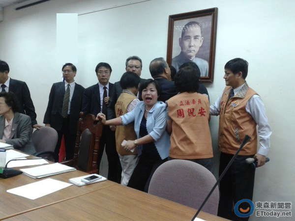 “自由經濟示范區特別條例草案”審查會議,因綠營“立委”包圍主席臺,造成會議停擺。(圖片來自臺媒)