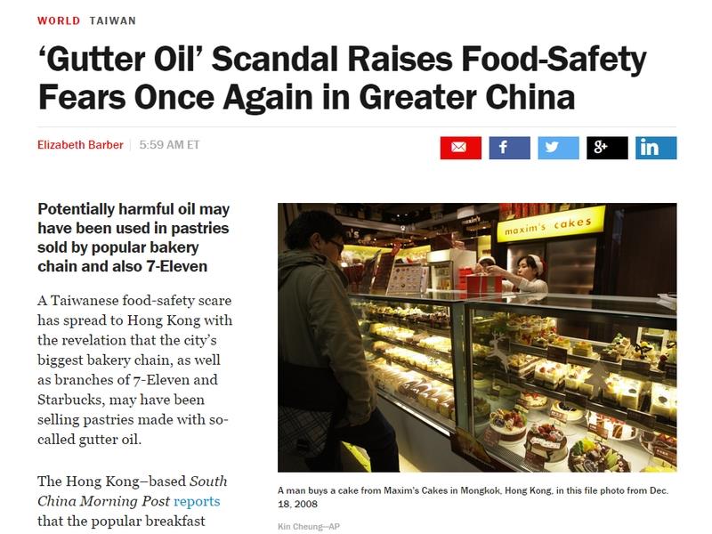 《時(shí)代雜志》網(wǎng)絡(luò)版今天以“‘餿水油’丑聞再次于大中華地區(qū)引起食品安全恐慌”為題報(bào)道,發(fā)生在臺(tái)灣的食品安全恐慌已經(jīng)散布到香港,香港最大的糕餅連鎖店以及7-Eleven、星巴克旗下連鎖店,可能都已經(jīng)銷售了以俗稱為餿水油制造的糕點(diǎn)。