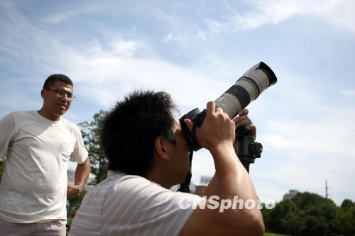 7月21日,浙江臺州的天文愛好者用帶防護鏡的鏡頭在日全食24小時前進行試拍演練。7月22日,本世紀最為壯觀、持續時間最長的日全食將在我國長江流域一帶出現。許多天文愛好者選擇觀測點、調試設備,設定拍攝系數,為觀測拍攝“日全食”做準備。 中新社發 陳林聰 攝