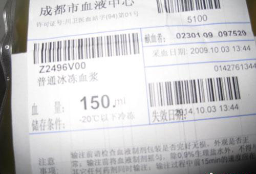 在圖片上,記者看到,血漿袋上標注著:成都血液中心、普通冰凍血漿、血量150“1、獻血者的編號等基本信息。令網友最為氣憤的是,血漿袋上標明的采血日期為:2009年10月3日13時44分,失效日期為2014年10月3日13時44分。“這表明,血漿并未失效,仍可使用。”