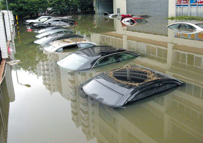 今晨,經過一夜暴雨后,廣州白云區黃石路一處停車場,多輛車輛遭遇“沒頂之災”。鄭迅攝(圖片來源: 羊城晚報)