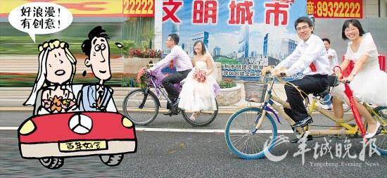 沒錯,這是一場別出心裁的單車婚禮。昨天上午,這對新人———新郎“尋找”、新娘“小驢佳佳”,在雨后初晴的廣州,如愿舉行了他們浪漫的“單車婚禮”。五六十名相識與不相識的“驢友”(網絡用語,泛指愛參加旅游、自助游的朋友),響應了這對新人的號召,騎車前來助陣,成全了這支特別的“婚禮車隊”。