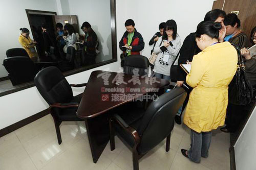 2010年4月20日是重慶市檢察機(jī)關(guān)開(kāi)放日,第一檢察院首次開(kāi)放辦案區(qū),市民盡可一探究竟。圖為辦案區(qū)內(nèi)的會(huì)談室桌子是三角形。(圖片來(lái)源:重慶晨報(bào) 通訊員 陳曹何 攝)