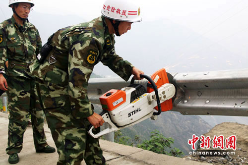 搶救人員正對排險處的鐵護欄進行切割處理。作 者:汶川縣新聞中心供