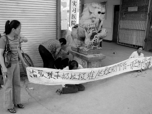 家屬在醫院門口拉橫幅討要說法。(圖片來源:云南網)