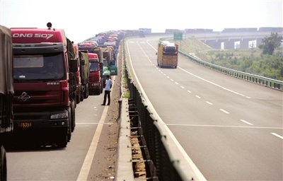 滯留的進(jìn)京大貨車排起長(zhǎng)隊(duì),與對(duì)面出京車道形成鮮明對(duì)比。