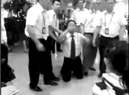 “大叔”再次勸說旅客登機未果,隨后單膝下跪,抱拳高舉頭頂。女乘客依然大叫沒用。大叔隨后雙膝下跪,兩手撐地,額頭點地。旁邊的工作人員想扶起大叔,大叔皆拒絕。