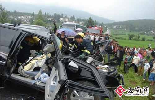 據初步調查,當天由陳某駕駛一輛皮卡車從下關往麗江方向行駛,車上載有6人。行至事發地點時與迎面而來的一輛宇通牌大型普通客車正面相撞,導致大客車駛出路面,側翻在路西邊,皮卡車橫停在路上。事故中,陳某等兩人當場死亡,乘車人張某于當日17時50分搶救無效死亡,14人不同程度受傷。