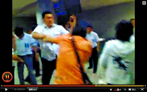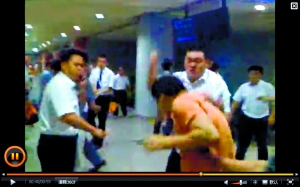 混亂中,數(shù)名東航工作人員追打一名提包的穿著黑衣旅客,一直追打至候機(jī)廳另一側(cè),有人衣服破損脫落。