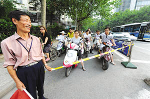 昨天下午5點左右正值下班高峰,在南京上海路和華僑路路口,汽車很多,騎車的人更多。記者發(fā)現(xiàn)三個路口慢車道上,協(xié)管員手里都拉起了標有“警察”字樣的“攔路繩”。在現(xiàn)場維持交通的民警告訴記者,他們來自機動大隊,當(dāng)日率先在上海路路口拉繩治違章,也是大隊的一次大膽試點。