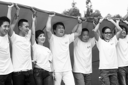 資料圖片:成龍率隊與北川中學千名師生共展巨幅國旗。