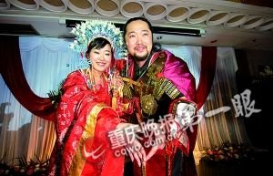 身著盛裝的美麗公主,在《皇上登基》的音樂聲中,與身高七尺、滿身鎧甲的帥氣“將軍”牽手走進婚姻殿堂———這不是古裝劇,而是昨日在解放碑新華酒店舉行的一場個性化創意婚禮。