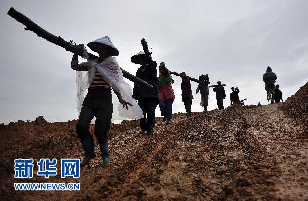 10月18日,海南省陵水縣竹俐水庫周邊村莊的群眾正在搬運木樁,加固堤壩。據(jù)海南省氣象臺消息,超強臺風“鲇魚”中心附近最大風力達17級,正以每小時25公里左右的速度向偏西方向移動,將于18日夜間進入南海東部海面,逼近海南島。目前,海南省陵水縣正加緊水庫泄洪和加固病險水庫,全力準備迎戰(zhàn)“鲇魚”。新華社記者 郭程 攝