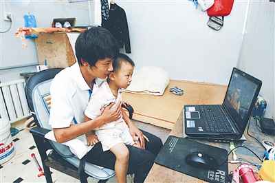 2010年8月,在青島一建筑工地,一位年輕的農(nóng)民工和弟弟在宿舍里用筆記本電腦看電影 楊登峰 攝
