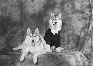 不久前,黃女士請(qǐng)攝影師為它倆拍婚紗照,哈士奇是好動(dòng)的狗,一下午黃女士和攝影師累得滿身是汗,總算拍了十幾張滿意的相片。黃女士拿著照片向記者介紹:坐得端端正正的,是“婚照標(biāo)準(zhǔn)像”;兩條狗狗一起望著右前方的,是在“憧憬未來(lái)”;“新郎”坐得高高的,“新郎”溫馴地趴在地上,那是最般配了……